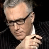 Description: Keith Olbermann, wearing a black pinstriped suit, looking down at something out of frame, his right hand holding a pen