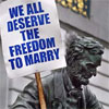 Description: close-up of a statue of Abraham Lincoln, holding a picket sign reading "We All Deserve The Freedom to Marry"