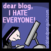 Description: Cartoon of a young girl, a purple streak in her hair, at a computer; the text reads "dear blog, I HATE EVERYONE!"