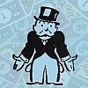 Description: Rich Uncle Pennybags, pockets turned out and palms upturned, over a background of Monopoly money