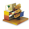 Description: figurine of a teddybear seated at an office desk, looking at a computer